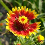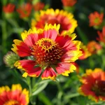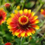 Trvalka s jasne červeno-oranžovými kvetmi a zlatým stredom, vytvára výrazný farebný akcent v záhrade.