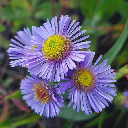 Многогодишно декоративно растение с едри, маргаритоподобни цветове в ясен синьо-лилав тон и жълт център.